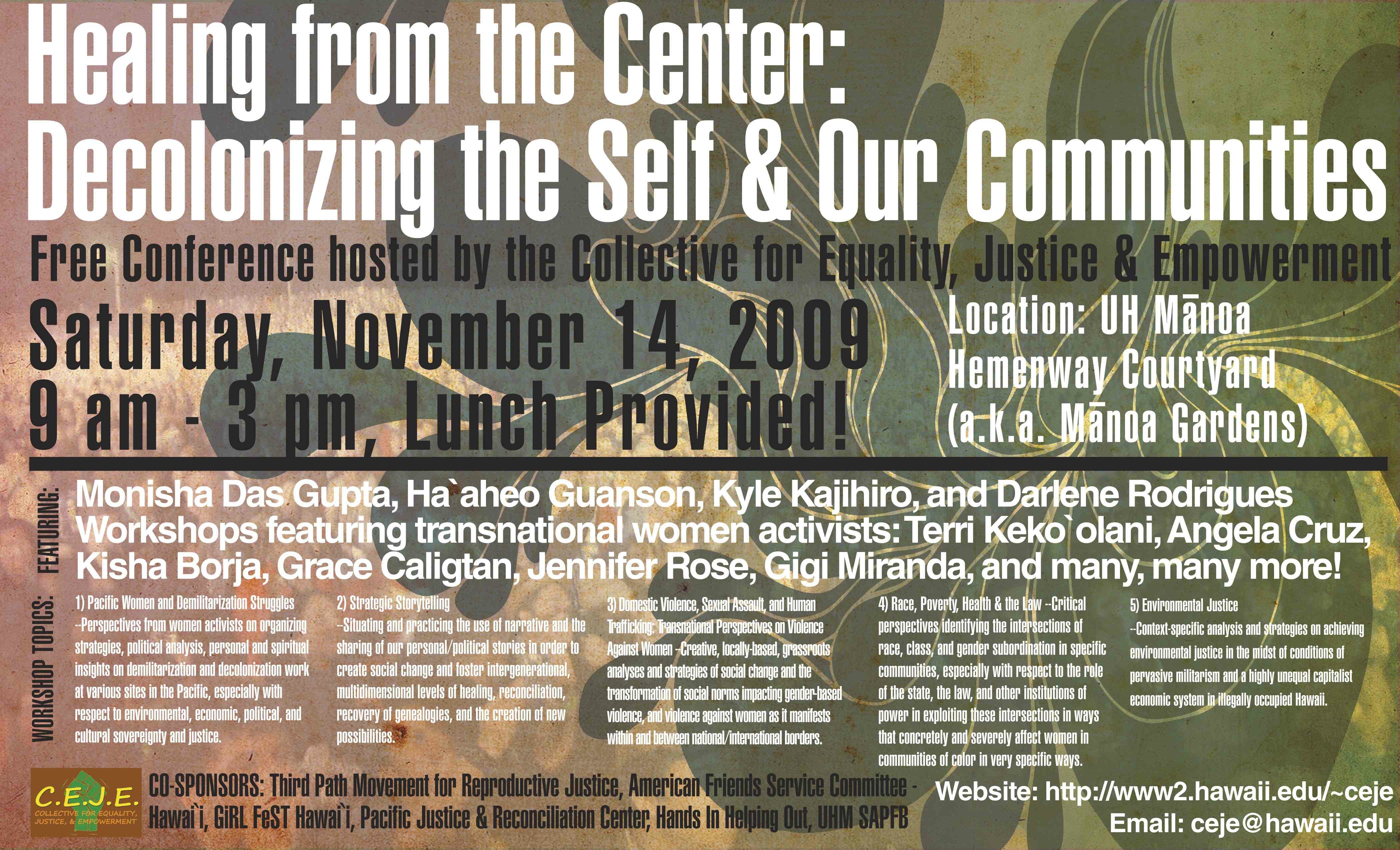 –Perspectives from women activists on organizing strategies, political analysis, personal and spiritual insights on demilitarization and decolonization work at various sites in the Pacific, especially with respect to environmental, economic, political, and cultural sovereignty and justice.