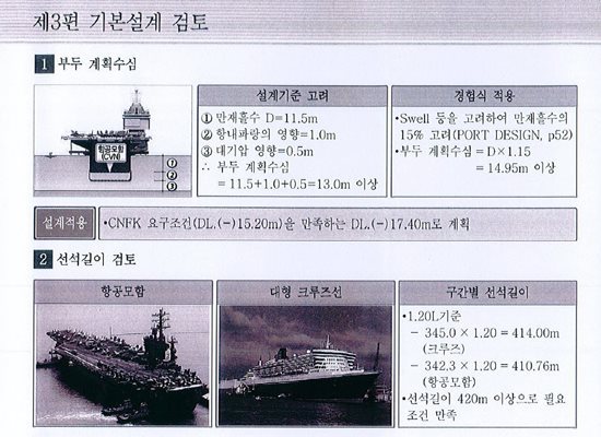 The image NO. 1 shows the planned water depth of the dock, based on aircraft carrier, while the NO. 2 shows the reviews on the length of the ships- the air craft carrier and big cruise. Based on the length of a cruise (414m) and aircraft carrier(410.76m), it says the condition should be for the ship length more than 420m.